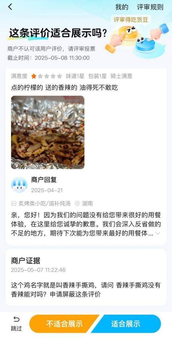 具体而言,当商家发起差评申诉后,饿了么会结合商家申诉类型、举证内容等进行综合判断,将部分差评申诉流转至“小饿评审团”。饿了么会把评价文字、评价图片、交易信息,以及顾客与商家的协商历史、证据资料等完整地呈现给小饿评审团,帮助其判断。