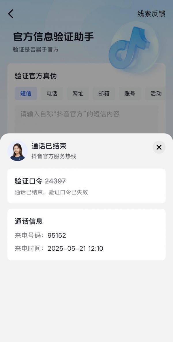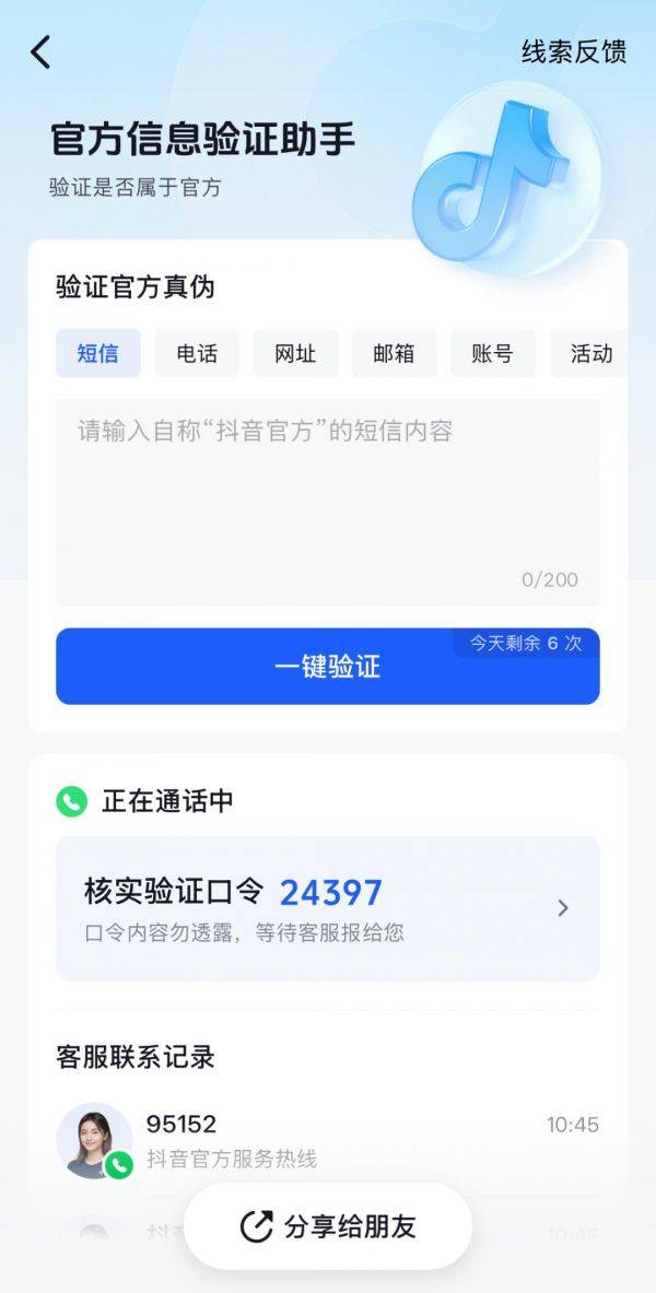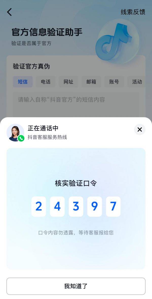 抖音推出“官方动态验证口令”,校验“真假客服”防诈骗