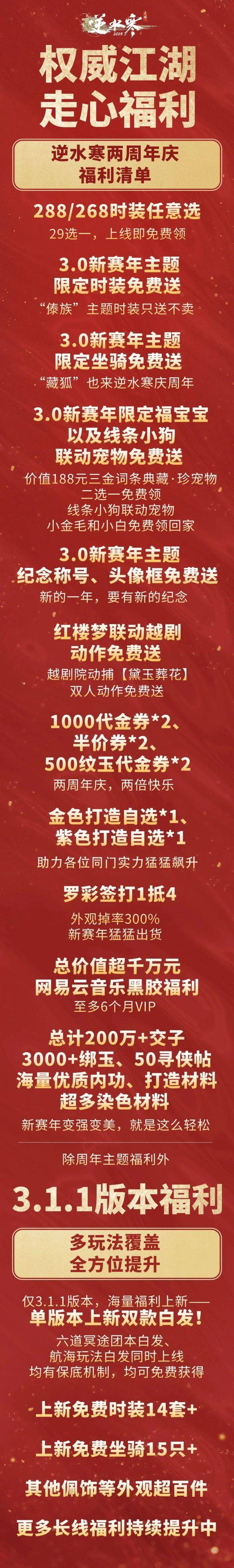新赛年开启期间,玩家一共可以获得两百万交子、3000 + 绑定纹玉、海量优质内功、50 寻侠帖、海量新赛年打造材料、超多染色材料等等福利补贴。