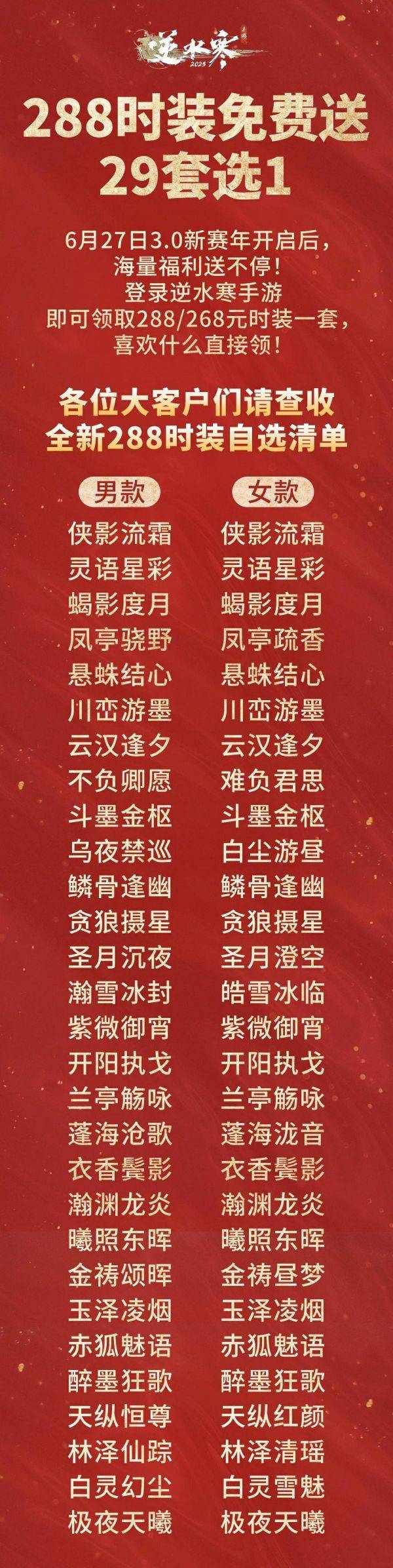 6 月 27 日,登录逆水寒手游,上线即可领取 288 时装自选一套。