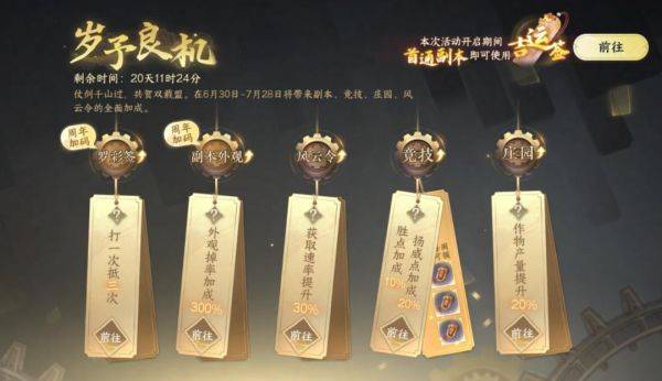 罗彩签刷 1 抵 3 活动再次开启。6 月 30 日至 7 月 28 日期间,岁予良机周年庆加码,罗彩签刷 1 抵 3、外观掉率加成 300%、首通使用吉运签;还有风云令获取速率提升 30%、胜点、扬威点、庄园作物产量提升。
