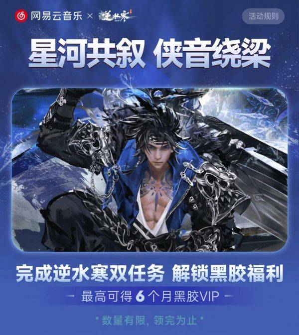 周年庆活动期间,在逆水寒内完成简单任务,即可解锁云音乐黑胶褔利,至高可得 6 个月黑胶 VIP。