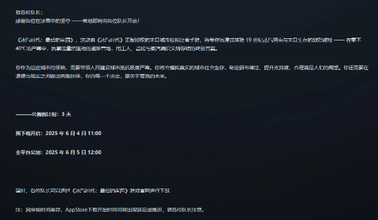 网易末世城市生存经营手游《冰汽时代:最后的家园》将于6月5日12点全平台公测,同时上线iOS和安卓平台,预下载现已开启。