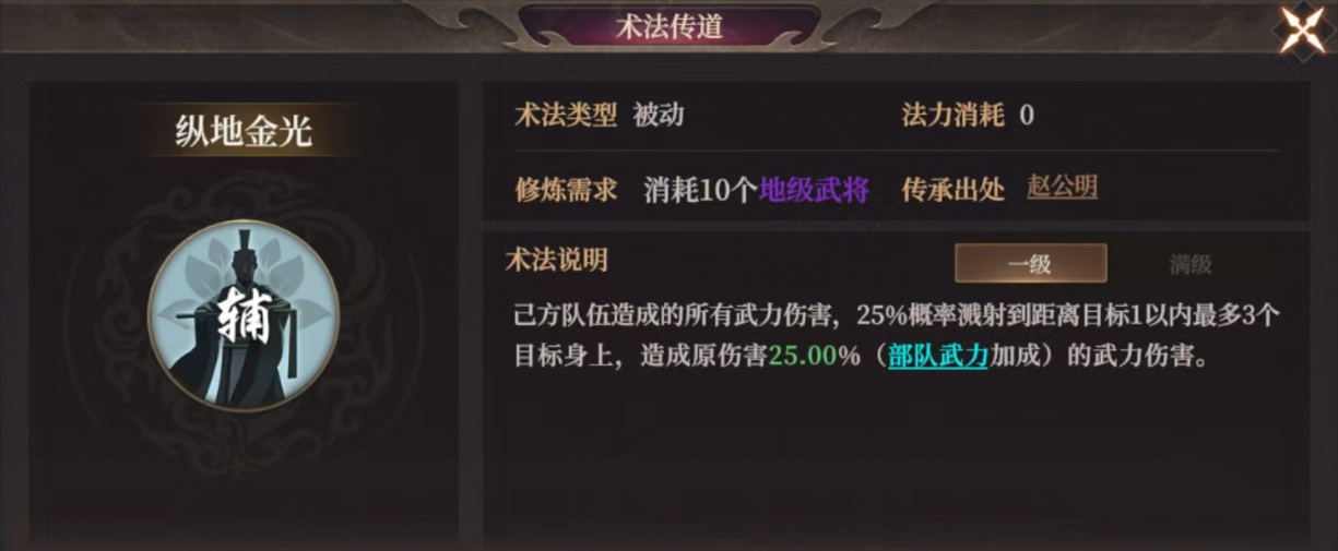 术法效果: 当你麾下的队伍造成任何形式的武力伤害时,"纵地金光"就有25% 的几率触发其核心效果! 一旦触发,此次伤害将会产生强力溅射,精准波及到初始目标周围1格范围内的最多3个额外敌人身上! 这些被波及的敌人,将承受此次原始武力伤害数值的 25.00% (别忘了,这个百分比还会受到你部队自身武力属性的加成强化!)