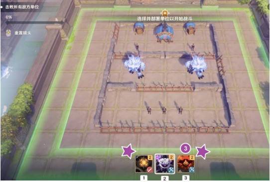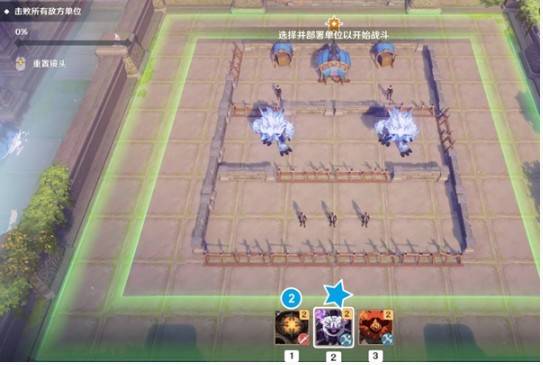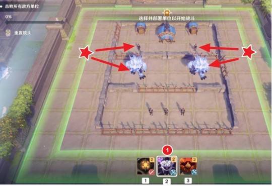 战斗伊始,立刻在场地左右两侧靠前位置(通常是靠近中路,但略靠边避免被轻易集火),各部署一个丘丘萨满。这是你整个战术的根基!萨满会自动召唤水柱攻击范围内所有敌人,其远程特性让它们几乎全程处于安全位置输出,最大化“更多火力”目标。