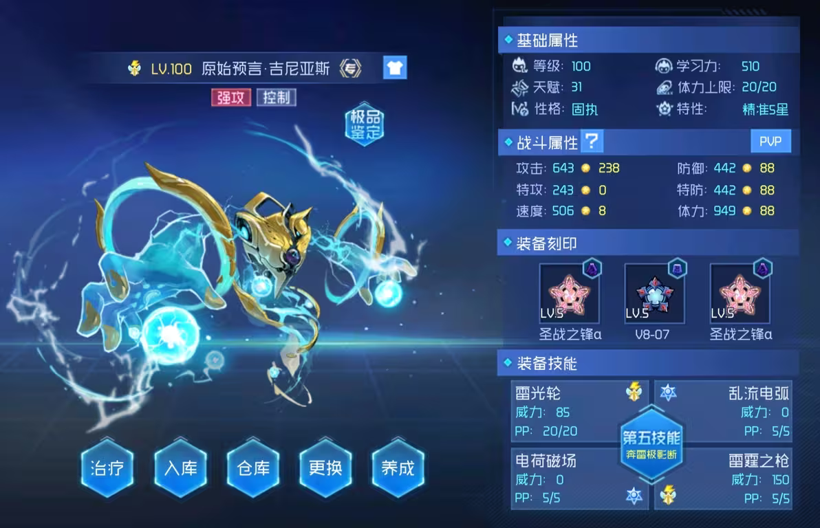 从摧枯拉朽的"奔雷极闪"到先发制人的"雷电突刺",从攻守自如的电荷切换到压制全场的电气磁场,原始预言·吉尼亚斯以其无死角的技能配置与多维特性矩阵,重新定义雷系精灵的战术天花板!无论是要塞攻坚还是巅峰对决,这只掌控雷电之力的预言者都将成为你最可靠的战略核心。现在就唤醒吉尼亚斯的雷霆之力,在赛尔号的星际战场上书写属于你的雷电传奇!