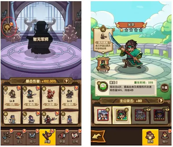 好消息!军师系统在游戏开局瞬间就已为你开启,无需苦苦等待!想要找到你的智囊团总部?很简单——直奔“兵营”场景,目光锁定界面左上角那个醒目的入口!成功招募军师后,立刻就能在这里将他们编入你的作战序列!