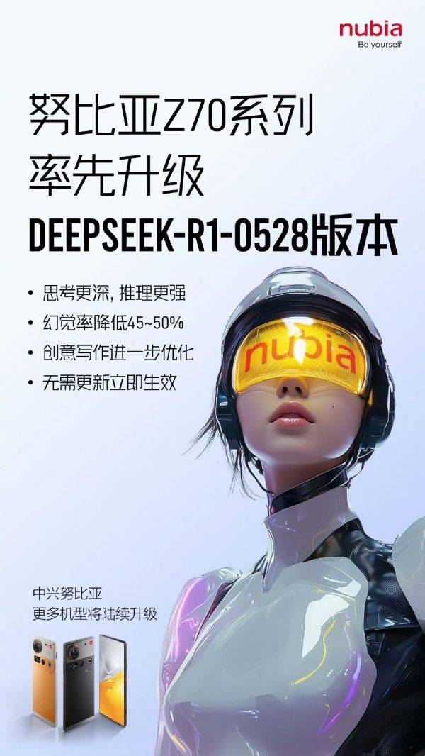 此外,努比亚手机官方本月(6 月 3 日)发文宣布:努比亚 Z70 系列全系产品率先升级 DeepSeek-R1-0528 版本,显著提升思维深度与推理能力。无需更新软件版本,立即生效。