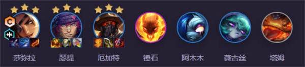 阵容思路: 莎弥拉在后排安心打伤害,乡村羁绊让她越战越勇!瑟提、阿木木和锤石组成铜墙铁壁,抗伤+控制拉满,给莎弥拉创造完美输出空间!