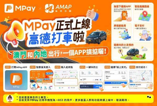为积极响应国家大力推动湾区“硬联通、软联通、心联通”与交通一体化,助力提升澳门智慧出行服务体验和技术创新,加速澳门智慧城市建设和经济适度多元发展,MPay于6月13日正式上线高德打车。其服务范围从内地延伸至澳门,实现澳门地区的士叫车、支付一站式服务。自此,澳门居民无须额外下载应用,即可在MPay内使用高德打车,真正实现“一个APP畅行澳门与内地”。