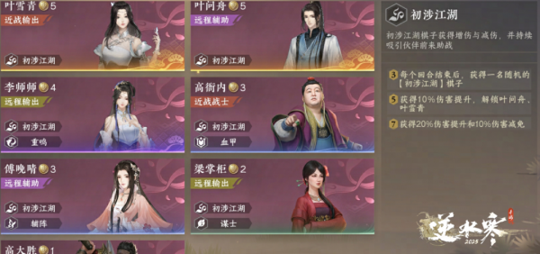 这儿有您【初涉江湖】遇到的伙伴与冤家,问舟师兄和雪青师姐也将陪您作战,还有李师师、傅晚晴、高衙内......Ta 们聚在一起将持续吸引一位伙伴前来助战,正如其羁绊名【初涉江湖】,很适合新手玩家使用。