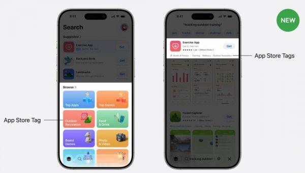 除此之外,为了提供标签的可发现性,这些标签将可以展示在App Store的关键区域,比如在搜索标签页面与App类别一起展示,并在搜索结果中与App一起展现。