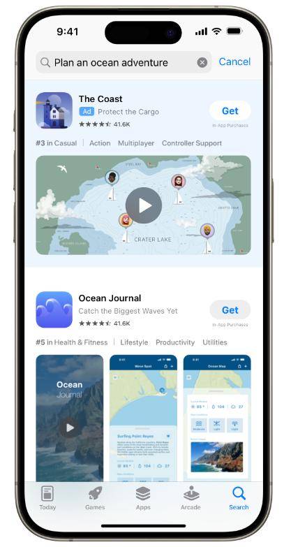 除了新增App标签,App Store搜索的另一个重磅变化是支持自然语言搜索,即用户可以根据自己的目标使用日常用语来描述自己想要的内容,或者查找特定的特性或功能,以在搜索结果中找到更准确、相关度更高的结果。