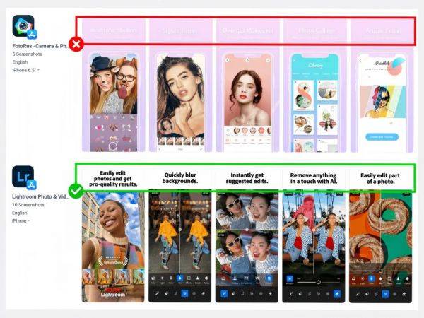 据国外一家移动应用数据分析平台介绍,截图中的关键词可以强化核心关键词,并引入新的关键词。也就是说截图中的关键词不会与名称、副标题或关键字版块中的关键词发生冲突,但会增加上述版块中相关关键词的搜索权重。并且,利用截图可以引入更多与主要元数据合并的关键词。比如,如果应用名称中包含关键词“照片编辑器”,此时我们可以在截图中添加“AI 照片编辑器”,以强化“照片编辑器”并将“AI”引入元数据组中。另外,该平台猜测苹果OCR算法可能不会读取整个截图,而是重点读取截图的顶部和底部区域。