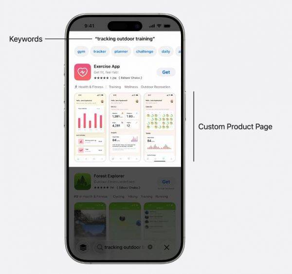 自定产品页功能自上线以来,主要被用于两个渠道:一是作为App Store外的宣传素材(此时的自定产品页不能出现在搜索中,但可以通过每个页面配有的URL链接将其用于营销活动或推向特定的受众),二是作为苹果Apple Ads的投放素材。不过接下来,这种局面将会改变。