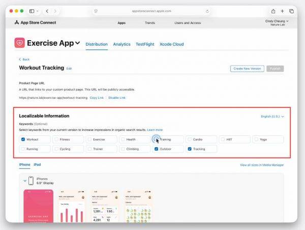 据介绍,自定产品页的关键词来源于App在App Store的最新版本,也就是说我们不能“随意”创建自定产品页的关键词,而是需要从App最新版本的关键词中进行挑选并分配给特定的自定产品页。