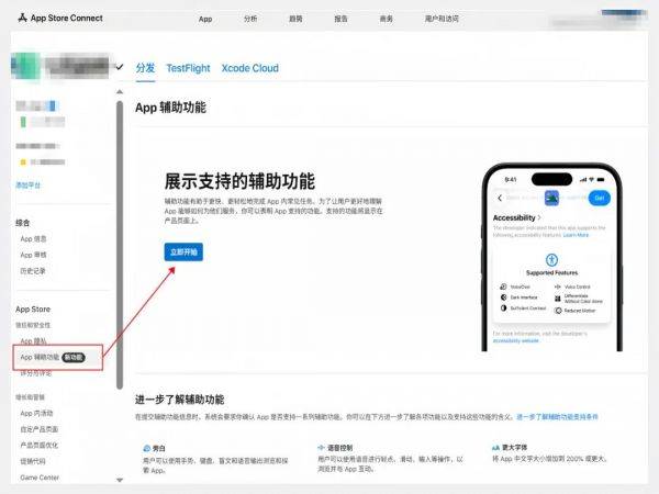 目前该功能Beta版已在App Store Connect上线,点击左侧菜单栏中的【App辅助功能】后,我们能看到对于该功能的详细介绍。