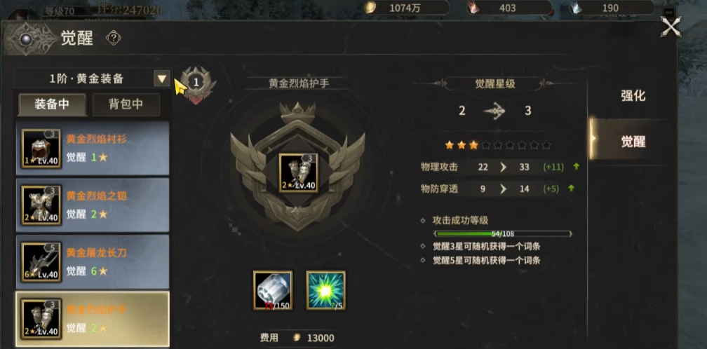 星级突破惊喜: 当单件黄金装备的觉醒等级达到 1星、3星、5星 这些关键节点时,会解锁一个强大的专属属性词条!这些词条提供独特加成(如攻击力暴涨、防御力飙升、暴击率提升等),不同职业可以挑选最适合自己战斗风格的词条,定制你的专属神装!