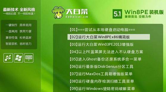 从U盘启动后,进入大白菜主菜单。按数字键 2 或使用方向键选择 [02] 运行Win10PE系统(新机型)(根据你的PE版本选择合适选项),按回车进入PE桌面。
