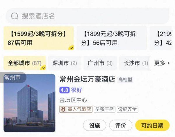 在高星级领域,酒店集团旗下的各种品牌出现,商家入驻的品牌效应开始显现,类似杭州 JW 万豪酒店、杭州钱江新城万豪酒店等万豪旗下的酒店品牌,都归属于万豪国际集团旗舰店中,进入旗舰店的直播间,发现更多酒店套餐选择。如万豪集团三晚加双份早餐,仅 1599 元,换算下来 500 元 / 晚左右,有常州金坛万豪酒店、杭州临安万豪酒店等酒店选择,不过套餐时间段限制在暑期。其他 OTA 平台上并没有套餐价,常州金坛万豪酒店在携程和美团上工作日的价格接近 600 元 / 晚,没有飞猪优惠。
