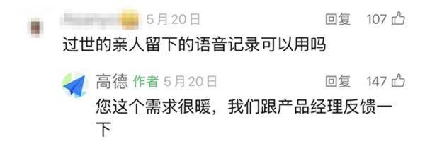 有用户留言称,希望利用过世亲人留下的语音记录制作导航语音包(公众号原留言记录已删除或隐藏,官方视频中分享的截图已为该留言用户昵称打码)。