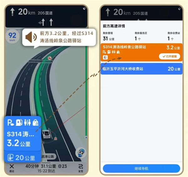 行驶中,驿站位置、距离清晰标在地图上,还有语音主动提醒前方驿站,不用担心错过。
