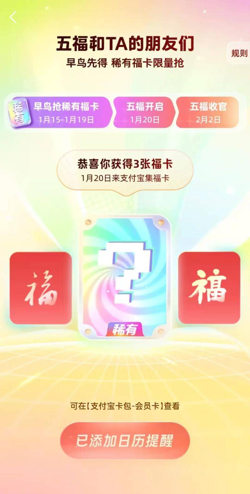 到了 2025 年,福卡玩法再度升级,福卡由 1 套扩展至 29 套,在传统五福之外,新增 28 套不同主题福卡;开奖次数也由 1 次提升至 5 次,每集齐一套即可立即开奖,无需等待除夕。