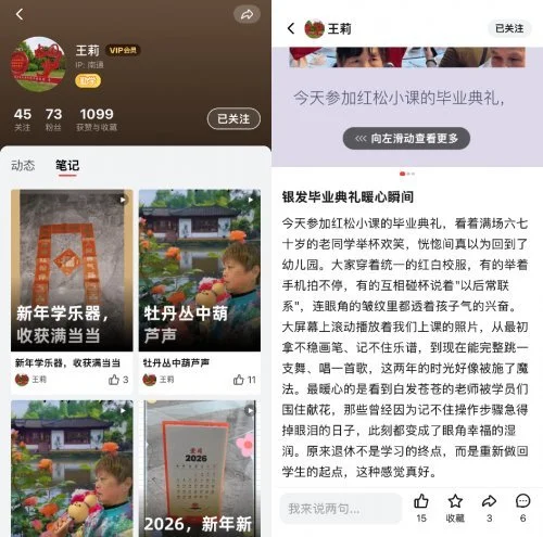 一名江苏南通的67岁用户王阿姨堪称典型用户样本。自“红松笔记”上线以来,王阿姨累计发布了177篇笔记,相当于平均每天发布近5篇。这些笔记中不仅包含她学习葫芦丝的演奏练习日常,还包括旅行、撸猫、手工制作、家庭相处、家乡美食推荐等日常生活。她在红松小课毕业典礼的笔记上写到:“原来退休不是学习的终点,而是重新做回学生的起点,这种感觉真好。”