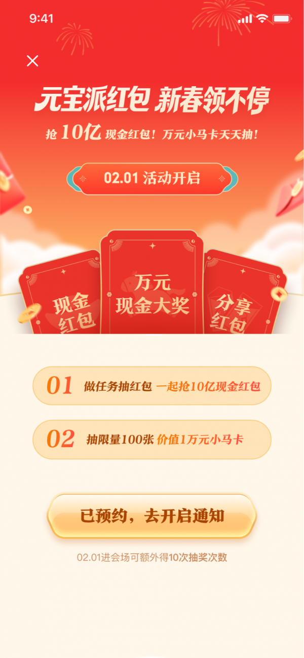 1月25日,元宝App更新到最新的2.55.0 以上版本,点击主页的预约卡片即可进入春节会场预约页面,提前预约的用户将在2月1日活动开启当天,额外获得10次抽奖次数。