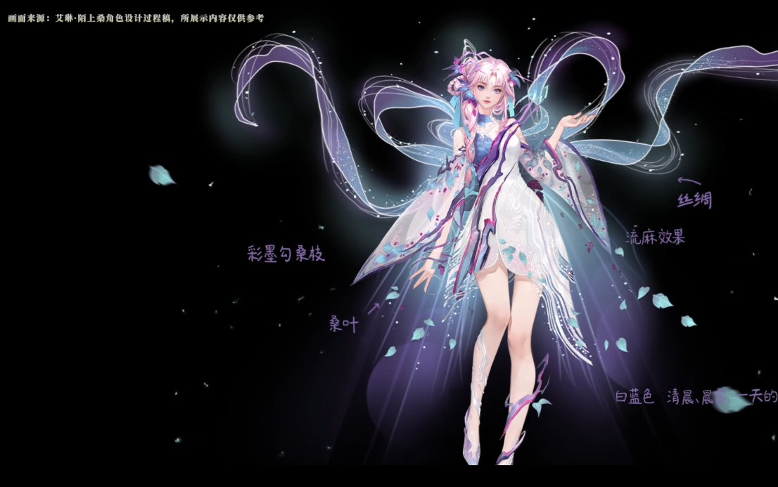 主色取自晨雾中桑树的白蓝色调,以桑果的紫红色作为点缀。艾琳身着轻罗薄纱,白色丝线环绕着裙摆,以桑枝勾勒轮廓,桑叶桑葚点缀其身,远观尤似身在清晨桑林的薄雾里。