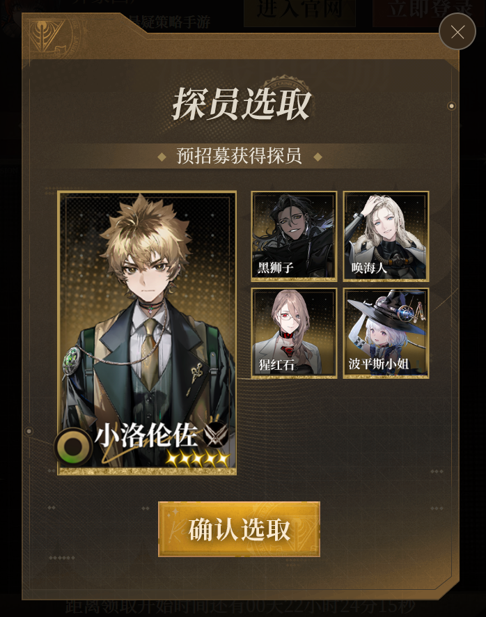 2.每20抽必出一名随机五星探员,若在未满20抽时抽中五星探员,必中次数将重新开始计算。完成120抽时系统将自动发放6位探员至【我的背包】中,以便科长获取心仪探员。